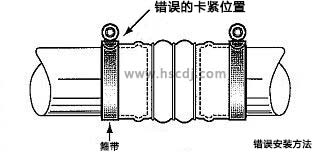 不正确的安装方式三:虽然喉箍也可以拧紧了,但是软管的膨胀、收缩及局部振动都会使软管壁受到切割力的作用,而且还会损害软管的强度。喉箍不断振动,最终也会导致软管泄漏。